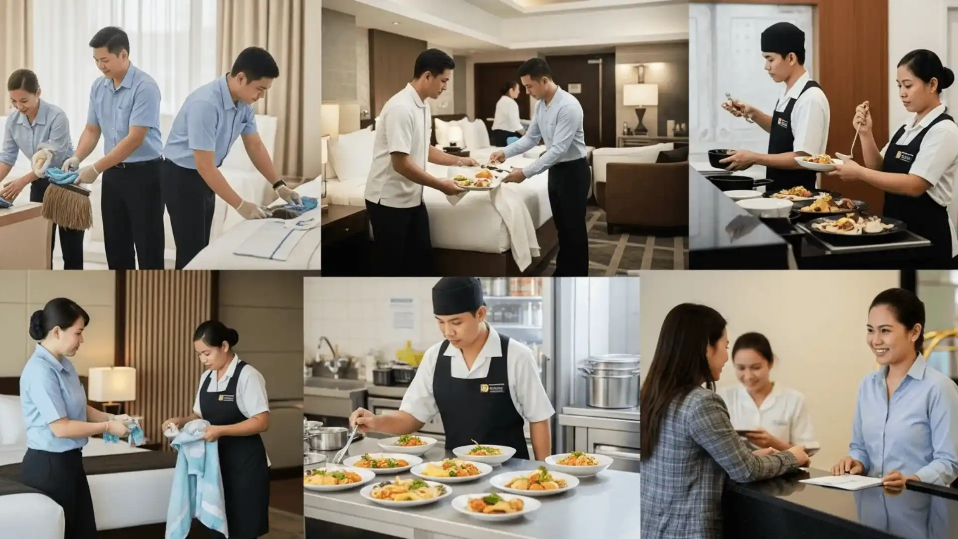 These services cover housekeeping, front desk work, food and drink service, logistics, and facility management.